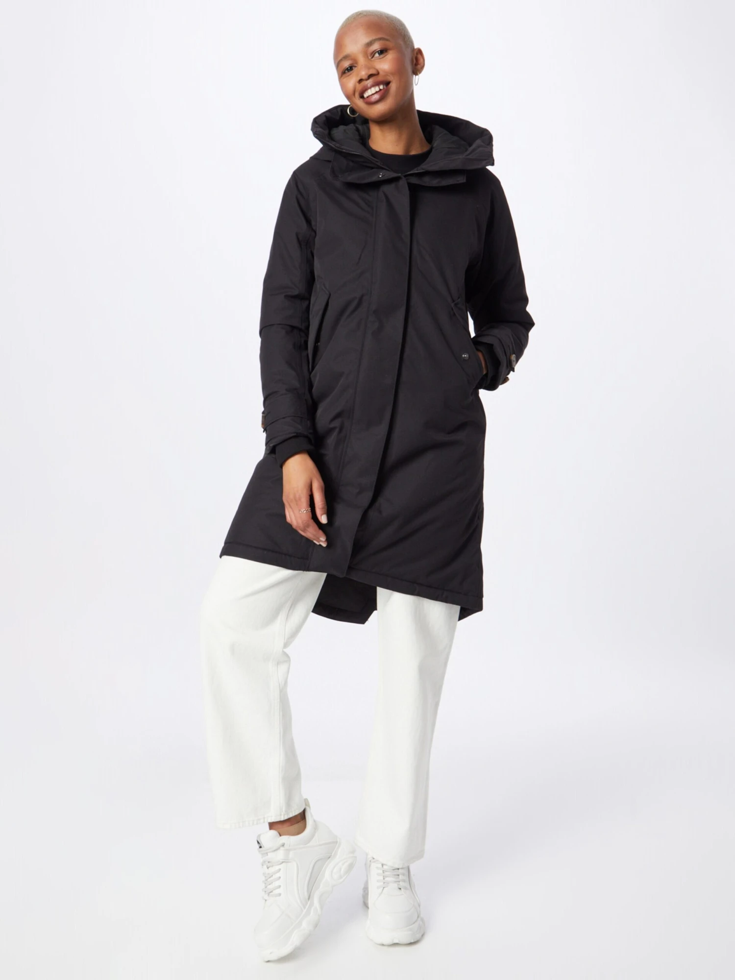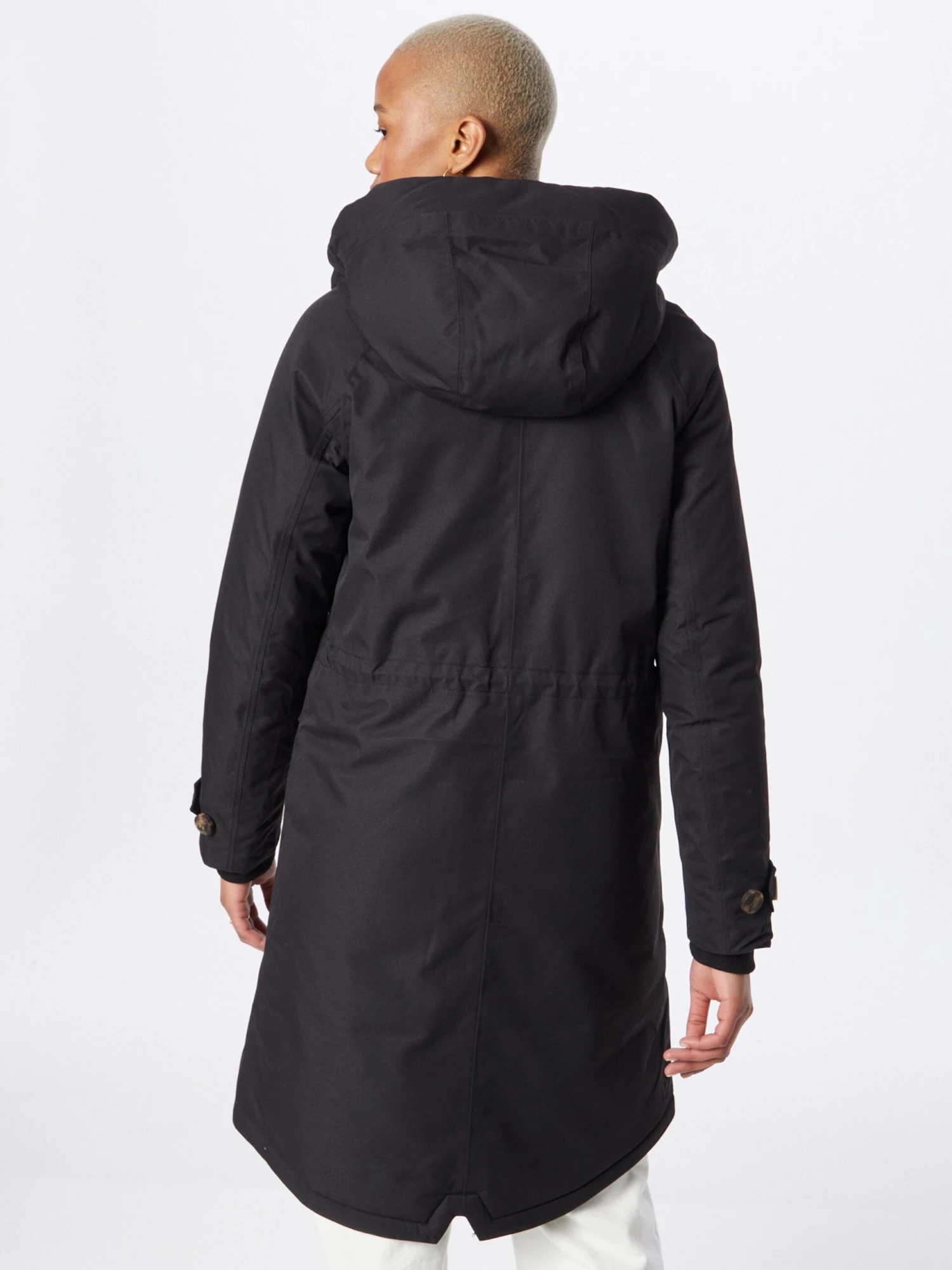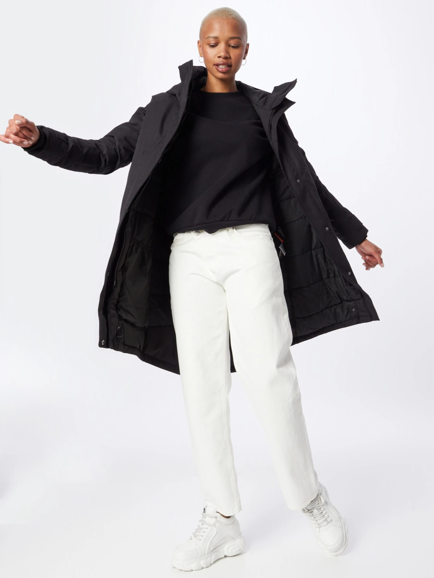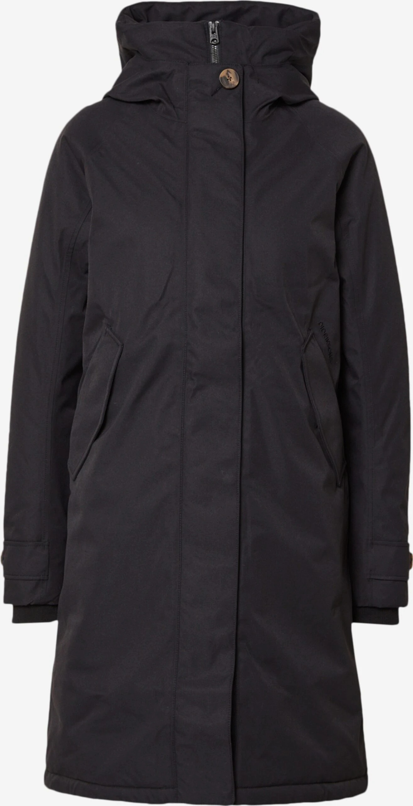Couleur unieBoutonnière avec boutons pressionCapuche avec col montantBord côteléFermeture éclair masquéePoches latéralesBroderie de l’étiquetteCoutures ton sur tonTissu lisseLégèrement doubléFermeture à glissière