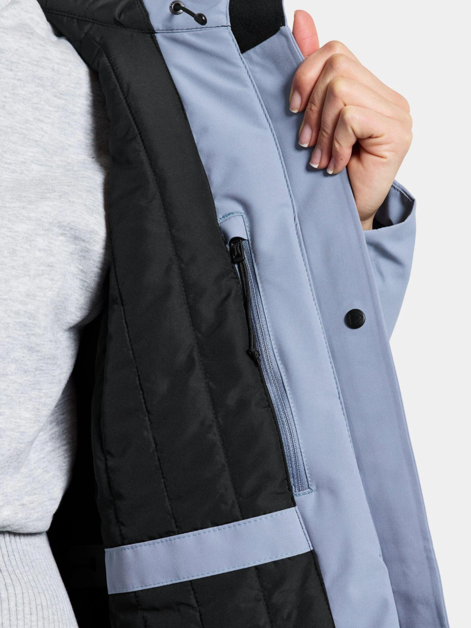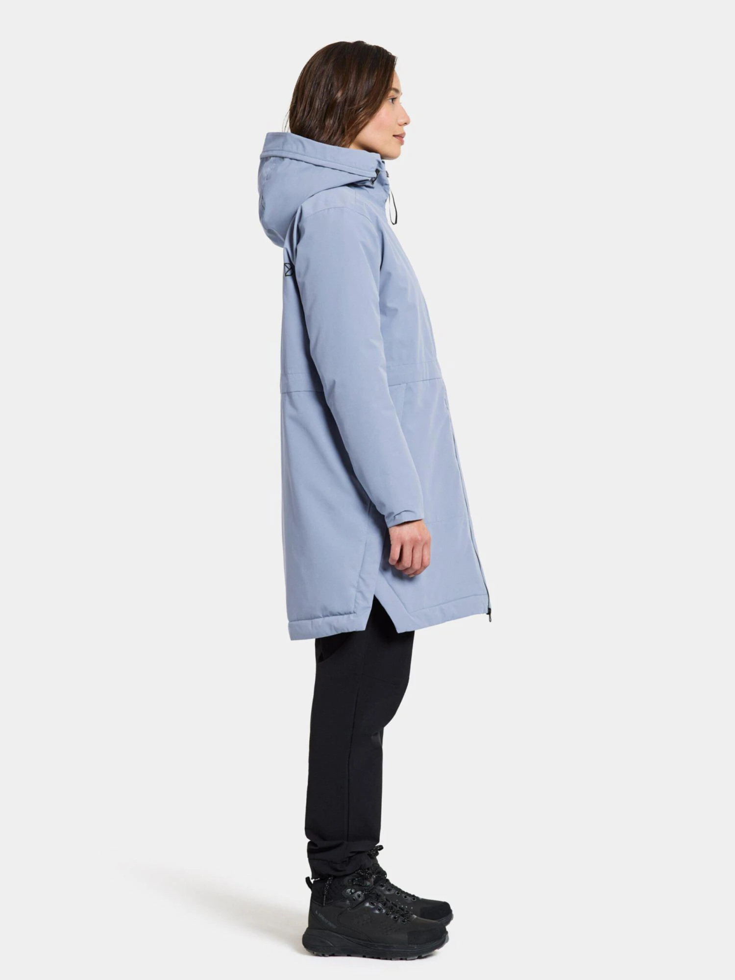 Couleur unieFerme jusqu’en hautPoches latérales avec fermeture éclairSans PVCAvec capucheLégèrement doublé