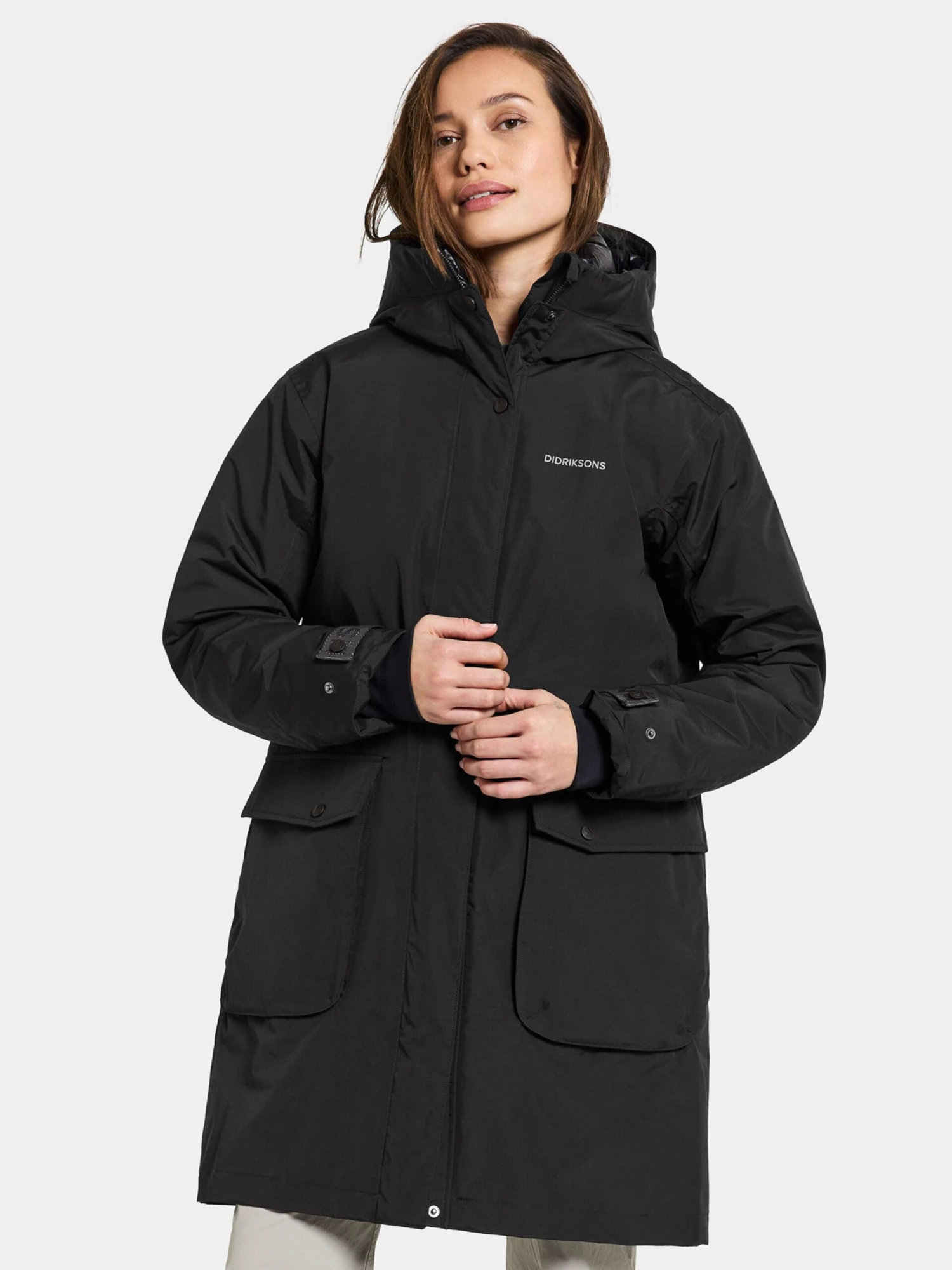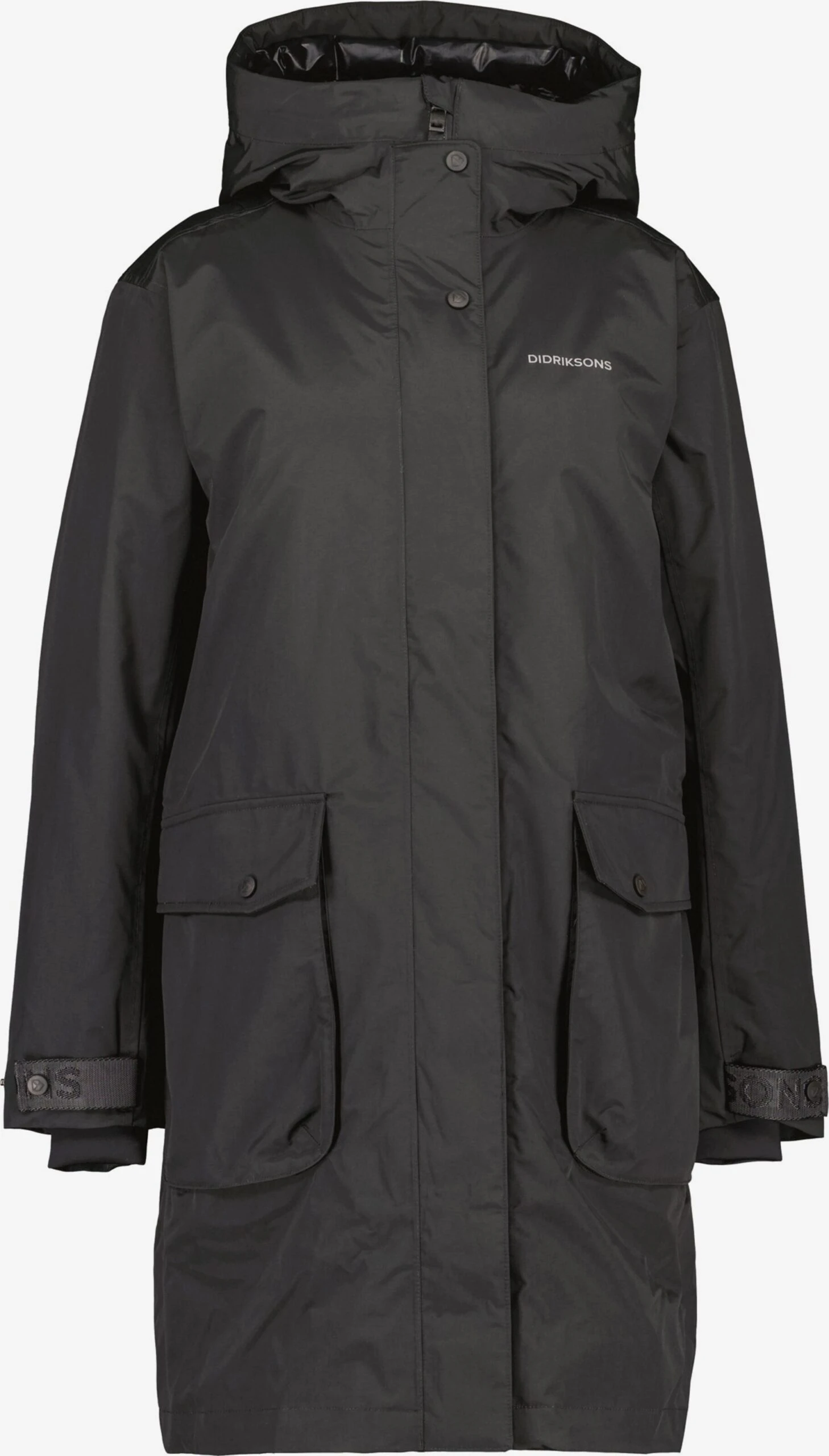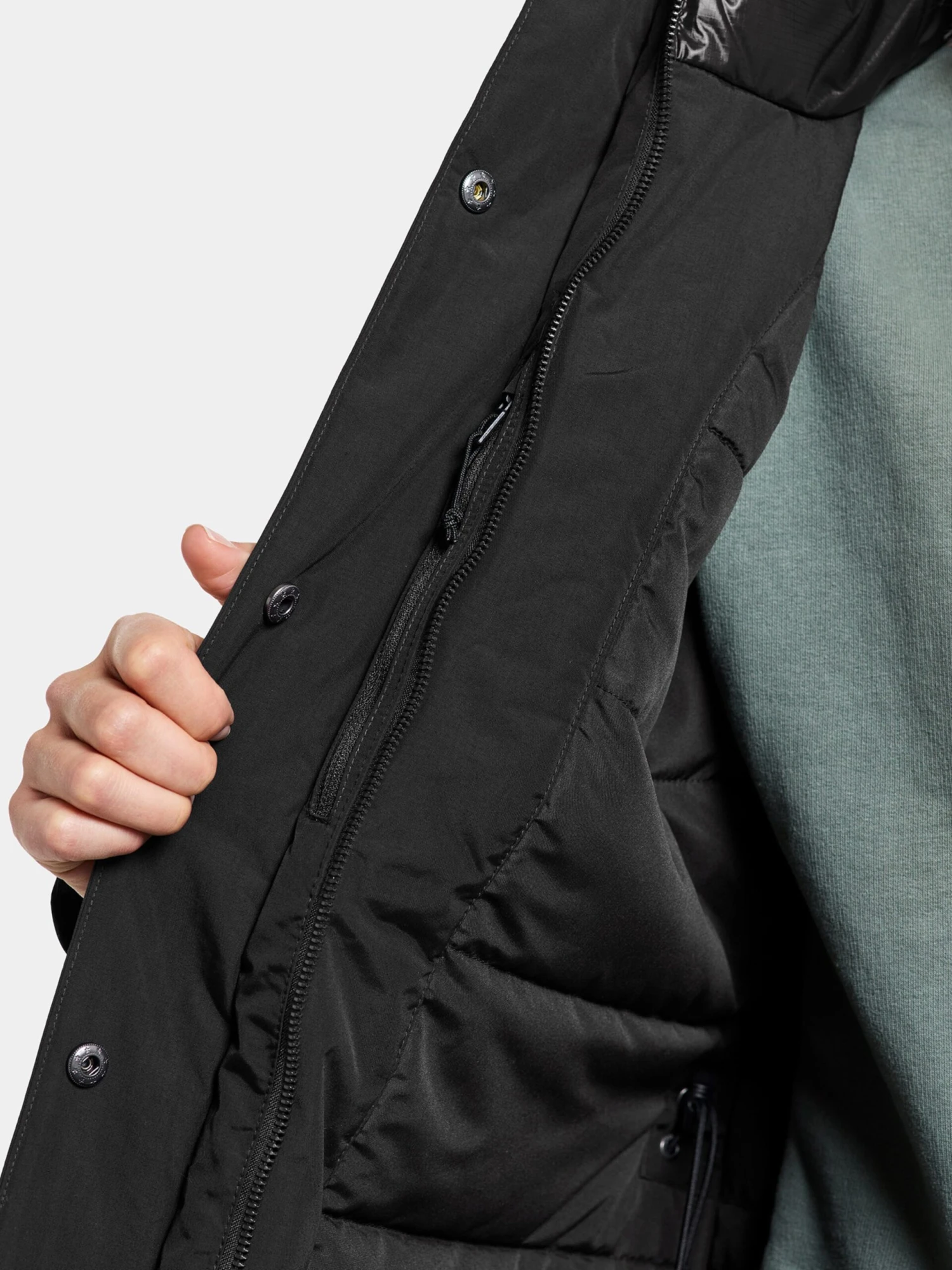 Couleur unieBoutonnière avec boutons pressionCapuche avec col montantFermeture éclair masquéePoche à rabat / à patteLabel PrintAvec capucheLégèrement doubléFermeture à glissière